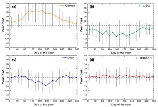 Comparison of mean bias for different diffuse solar radiation products: (a) CERES, (b) ERA5, (c) JIEA, and (d) CHSSDR.