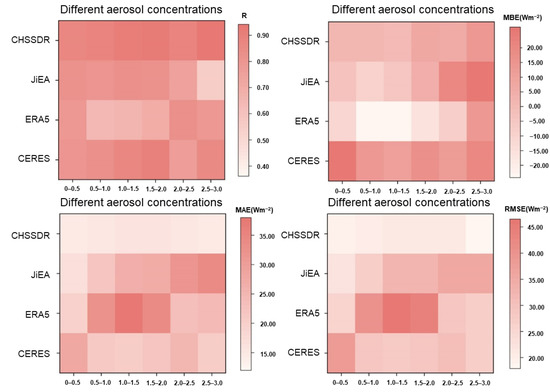 In addition, we also compared the accuracy of four diffuse solar radiation products under different aerosol concentrations conditions, with the variation of each validation index presented in Figure 9. Aerosol optical depth data were derived from the MERRA-2 dataset and separated into six intervals, based on maximum and minimum values: 0~0.5, 0.5~1.0, 1.0~1.5, 1.5~2.0, 2.0~2.5, and 2.5~3.0. The R values in the range 0~0.5 are in the order of the CHSSDR (0.86) > JiEA (0.82) > CERES (0.80) > ERA5 (0.78). The R values are in the order of the CHSSDR (0.94) > CERES (0.85) > ERA5 (0.79) > JiEA (0.55), in the range 2.5~3.0. One obvious phenomenon is that the R value of JiEA falls dramatically with increasing aerosol concentration. Aerosol has a complex chemical makeup; because of the atmospheric environment, it is prone to secondary chemical changes, which can affect product accuracy [67]. The MBE values of CERES are all positive, indicating large overestimation (MBEmax = 30.83 Wm−2). ERA5 still reveals significant underestimation (MBEmin = −23.06 Wm−2). The highest MBE values of CHSSDR and JiEA are 13.84 and 22.03 Wm−2. The ERA5 has the highest deviation under different aerosol concentrations, with MAEmax = 36.48 Wm−2 and RMSEmax = 46.44 Wm−2. CHSSDR has the least deviation, with MAEmax =16.01 Wm−2 and RMSEmax =21.51 Wm−2. For a variety of aerosol concentration conditions, the deviations (MAE and RMSE) of all four diffuse solar radiation products rise with increasing aerosol concentration. In general, CHSSDR has the highest R value and lowest deviation among the four diffuse solar radiation products.