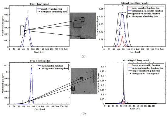 In Figure 1a,b, the gray values of the training samples present a bimodal distribution around 50 and 75 and an asymmetric unimodal distribution between 40 and 60, respectively. Therefore, the T1FM membership function with single-peak feature cannot accurately characterize the gray distribution and thus cannot fit the double-peak and tail parts. Aiming at the problems existing in T1FM, by constructing the IT2FM membership function, the above uncertainties are placed in a certain area to solve the modeling problems caused by the uncertain characteristics. From the right part of Figure 1a,b, it can be concluded that the uncertainty footprint of IT2FM with uncertain mean and standard deviation changes on the X-axis and Y-axis, respectively, as the adjustment factor changes. Therefore, IT2FM is used to describe images with uncertain pixel grayscale characteristics in homogeneous regions and small grayscale changes and high frequency difference in homogeneous regions.