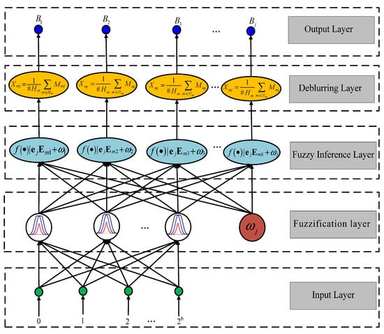 The structure of the interval type-2 fuzzy neural network is shown in Figure 2, which includes the input layer, fuzzification layer, fuzzy inference layer (membership function layer), deblurring layer, and output layer. The input vector of the input layer is the gray value of each training sample; the input layer in this model directly transmits the data to the fuzzification layer, that is, there is no weight parameter between the input layer and the fuzzification layer. A fuzzy layer can define fuzzy membership functions (Equations (3)–(6)) for each neuron node, including type-1 fuzzy membership functions and upper and lower membership functions of interval type-2 fuzzy models, and perform fuzzy operations. In this layer, the number of neuron nodes is three times the number of categories; the completed function is to model the input data and the spatial correlation of the data in the image gray space and realize the uncertain expression of the degree of membership of the input vector. The fuzzy inference layer performs fuzzy operations according to the characteristics of the input data, and the piecewise linear function is used for fuzzy inference in this paper. The deblurring layer expresses the neighborhood features of the fuzzy inference results in the membership space; the output layer outputs the decision membership degrees of the data in each category.