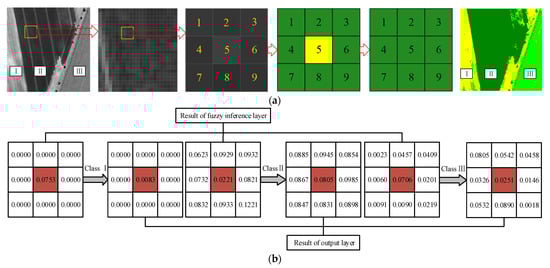 The yellow pixel represents the No. 5 pixel, the green pixel is its neighbor pixel, and the gray value of the neighbor pixel is similar to that of class II and class III. According to Figure 3b, it can be seen that the output results of the No. 5 pixel belonging to I–III categories in the fuzzy inference layer are 0.0753, 0.0221, and 0.0706, respectively. According to the principle of maximum membership, the No. 5 pixel belongs to class I. The output layer results for the No. 5 pixel belonging to classes I–III are 0.0083, 0.0805, and 0.0251, respectively. According to the principle of maximum membership, the No. 5 pixel finally belongs to class II, which is in line with the expected classification result.