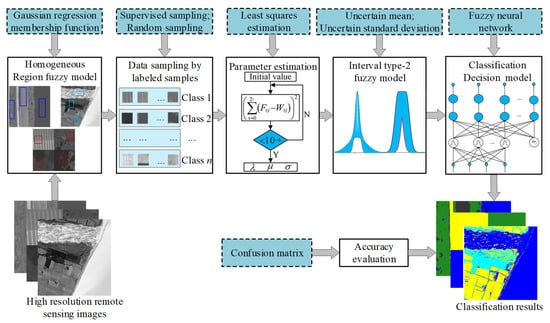 Complex surface features and land cover information are the two major characteristics of high-resolution remote sensing images [1], and their accurate classification results can be widely used in national economy and social services [2], especially in the fields of large land use [3], land cover mapping, and disaster prediction [4]. At present, accurate land cover mapping, especially high-resolution remote sensing mapping, is facing challenges such as increased heterogeneity among the same features and increased similarity between different features [5]. High spatial resolution remote sensing images can more accurately analyze the type of land cover; however, the improvement of spatial resolution also brings new challenges to existing classification methods, on the one hand, because of the increased uncertainty between different land cover, and, on the other hand, because remote sensing technology is used in more heterogeneous areas (such as suburbs and urban areas), which contain a large number of shadow effects, multiple materials, and color differences [6]. It can be seen that prior knowledge plays a part in the coverage classification technique. There are three main difficulties in the research on land cover classification of high-resolution remote sensing images. (1) The uncertainty that a pixel belongs to a certain class increases. Complex spatial information changes the characteristic function curve of homogeneous areas, resulting in the histogram of the same ground object showing asymmetric and multi-peak or single-peak irregular distribution characteristics [7]. Moreover, the fine spatial structure also increases the heterogeneity of homogeneous regions and the similarity of heterogeneous regions. The overlapping area of the pixel gray characteristic function curves of different land cover increases [8]. (2) There is uncertainty in modeling. The improvement of the image resolution increases the uncertainty of the gray level of the feature pixels in the homogeneous area, and the model based on the uncertain feature pixels is also uncertain, which further increases the difficulty of a classification decision. (3) The amount of data increases dramatically compared to images of medium and low resolution. Under the same land cover, the number of ground objects in remote sensing images increases sharply with the increase in spatial resolution [9].