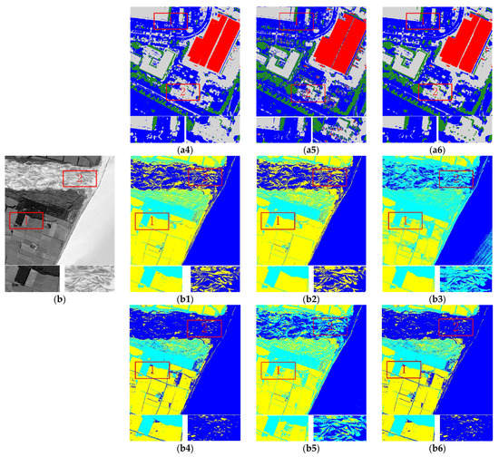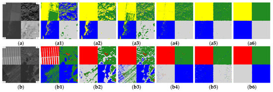 The image sizes of Figure 5a,b are both 256 × 256 pixels. Labels 1–8 represent eight types of land cover. In the first category, the gray values of the two paddy fields are different, and the gray characteristics of the lower paddy field are similar to those of the forest. In the second category, the gray value span of the forest is large. For cement pavement, the grayscale characteristics of many pixels are quite different from this area. For the fourth category, the gray characteristics of floating ice are similar to those of cement pavement. The fifth category is the building roof, which mainly contains two different gray features. The sixth category includes sparse trees and housing areas. The seventh category is the wetland, with a little soil in the water. The eighth category includes vegetation and animals. The experimental results obtained by applying different classification methods are shown in Figure 5(a1–b6).