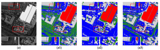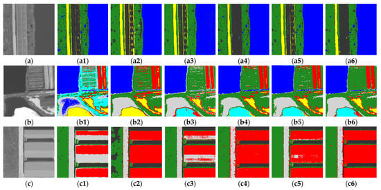 In Figure 6a–c, with 256 × 256 pixels, there are a large number of pixels with similar gray characteristics in vegetation and asphalt roads and there are many traffic sign lines and small cars on asphalt roads with gray characteristics similar to that of bare land. The gray features of the water area are uniform and evenly distributed. The grayscale characteristics of the water area are evenly distributed, and the grayscale of the ice–water mixing area is similar to that of the water area and the vegetation on the bank. The gray value of shadows produced by buildings and trees are highly consistent with the waters, and the grayscale characteristics of snow and frozen soil area regions are similar. Owing to different illumination levels and time, the grayscale on one side of the roof is similar to that on the road. The experimental results obtained by applying different classification methods are shown in Figure 6(a1–c6).