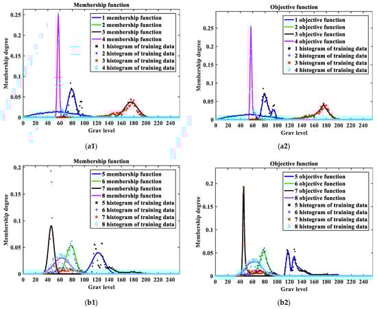 Training data histogram, membership function, and objective function of synthetic images, (a1,b1) type-1 Gaussian model, (a2) the IT2FNN_GRM method with an uncertain standard deviation (к1 = 0.35, к2 = 0.42, к3 = 0.54, к4 = 0.40), (b2) the IT2FNN_GRM method with an uncertain mean (η1 = 3.0, η2 = 2.5, η3 = 2.0, η4 = 2.7).