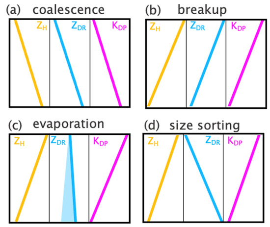 Different microphysical fingerprints for liquid precipitation, including (a) coalescence, (b) breakup, (c) evaporation, and (d) size sorting. In panel (c), the lighter cyan shading indicates a range of possible fingerprints for ZDR, based on work by [45].