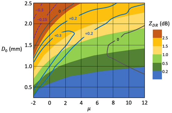 Adapted from [45]: color shading shows ZDR at top of rainshaft (dB according to outset scale); labeled solid contours show change in ZDR (in dB) over the 3 km rainshaft (positive indicates increase towards ground, negative indicates decrease towards ground) as follows: gray is zero change, blue contours are +0.2 and +0.3 dB; purple dashed lines are −0.15 and −0.3 dB. Results are shown as a function of initial gamma DSD (i.e., at the top of the domain) shape parameter on the abscissa and mean volume diameter D0 on the ordinate. Computations were performed for X band.