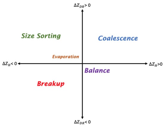 Fingerprint parameter space of [44]; shows dominant processes (colored text in each quadrant) inferred from vertical gradients in ZH and ZDR (, with changes towards ground). For example, coalescence is inferred from vertical profiles of ZH and ZDR that increase towards the ground (i.e., ZH > 0 dB and ZDR > 0 dB).