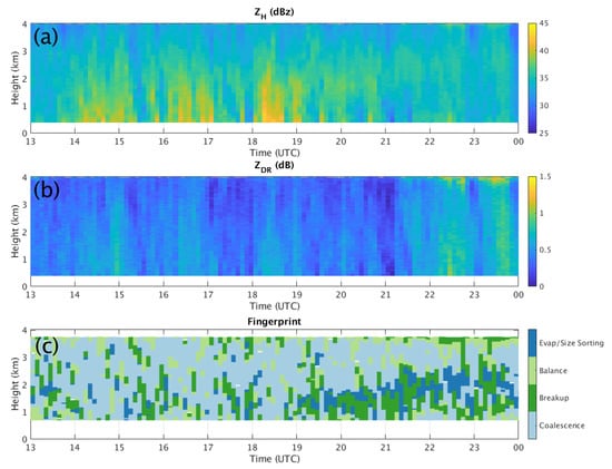 The resulting fingerprint classifications are shown in Figure 5c. Despite some noisiness in the retrieval, an obvious feature is the prevalence of the coalescence fingerprint (54.4% of identified pixels). That coalescence should dominate the signal in tropical rainfall is expected based on the relatively small raindrop sizes (e.g., [44]). The breakup and “balance” fingerprints were identified in 19.3% and 15.7% of the pixels, respectively. Evaporation and/or size sorting was only identified in 10.6% of the pixels; interestingly, most of these occur after 19 UTC. Because of the spatial averaging involved in the QVP technique, one might not expect to see size sorting (which tends to be localized; see [61,62,63,64,65,66,67]) appear; indeed, the vertical gradients in ZDR after 19 UTC are small in magnitude. Recall that during this time, Hurricane Matthew was ingesting drier air from the west. Thus, this signal of increased prevalence of the evaporation fingerprint throughout this period is at least broadly consistent with the observed storm evolution.