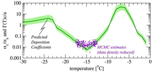 The green line shows the ratio of deposition coefficients for the ice crystal c and a axes as a function of temperature, with the green shading indicating the uncertainty, extracted from wind tunnel measurements (from [129]). The purple dots show the inherent growth ratio () times the ice crystal axis ratio obtained from Markov chain Monte Carlo simulations and X-band polarimetric radar observations (plotted with reduced data density, for clarity). Reprinted/adapted with permission from [77]. 2021, American Meteorological Society.