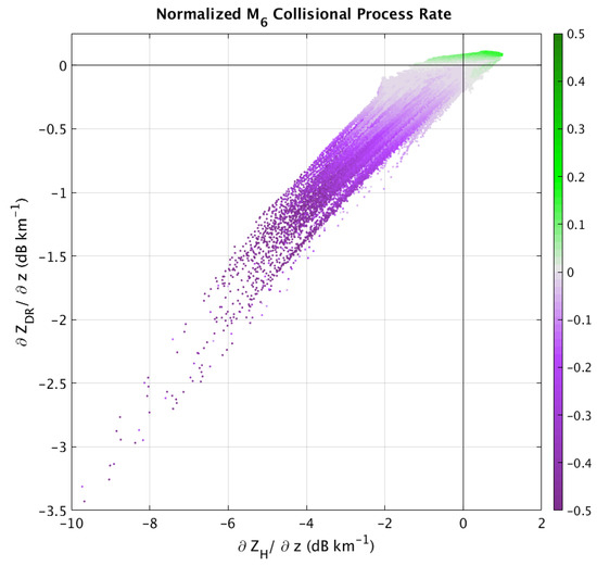 Figure 8 shows the [44] parameter space with points colored by their M6 collisional process rate, defined as the sum of the rate of change in M6 owing to coalescence (positive) and breakup (negative). The values are normalized on a 0 to 1 magnitude scale to facilitate comparison of different rainfall rates, etc. As such, the resulting positive or negative values indicate when one process wins out over the other: positive values indicate coalescence is dominating changes in M6 (which is closely related to ZH at S band), negative values indicate breakup is dominating changes in M6, and values near zero indicate a balance between these two processes. We can see that, in general, the breakup-dominated cases (negative values, purple dots) do fall within the “breakup” quadrant of the [44] parameter space, as expected. Likewise, the coalescence-dominated cases (green dots, positive values) are found mainly within the coalescence quadrant. Further, there is a tendency for stronger magnitudes of these processes to fall deeper within their respective quadrants, implying that the magnitudes of the radar fingerprints are related to the magnitudes of the process rates.