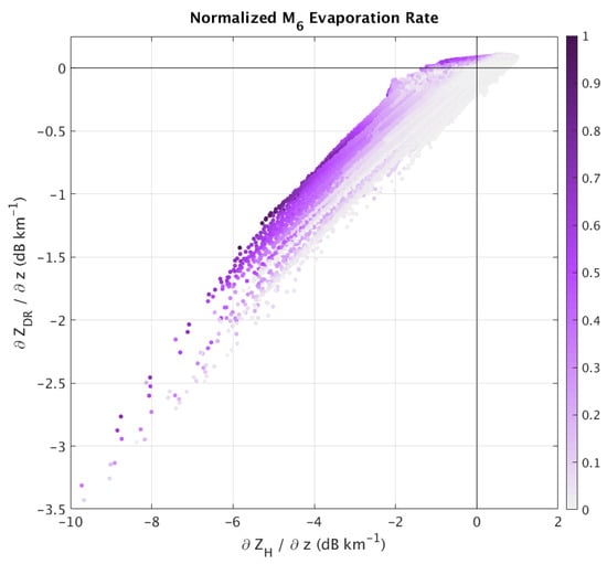 Figure 9 displays the same type of information, but this time for the M6 evaporation rate. Note that the process rate has been normalized and displayed between 0 and 1, such that 1 is the maximum evaporation rate. Recall that evaporation leads to a decrease in M6 (and thus ZH). The M6 evaporation rates exhibit large magnitudes in the “evaporation” quadrant, as well as the “breakup” quadrant. Interestingly, there is a clear shift of increasing magnitudes moving towards the top left within the cloud of points—in other words, even for points in the “breakup” quadrant, those closer to the evaporation quadrant of the [44] parameter space have larger M6 evaporation rate magnitudes. Further, the larger the breakup process rate magnitude, the larger the evaporation process rate magnitude, presumably because both scale with M6 and/or precipitation rate. Thus, even when evaporation does not dominate the observed changes in the dual-polarization radar fingerprints, information about the magnitude of evaporation is contained in the proximity to the evaporation quadrant, when displayed in the [44] parameter space diagram.