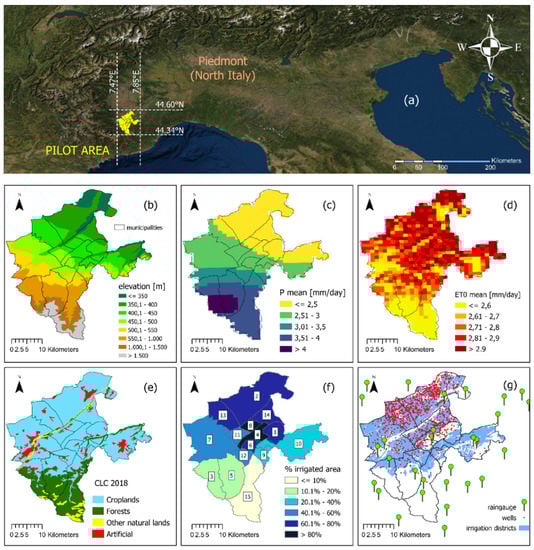 Characterization of the pilot area: location, elevation above mean sea level, climate, croplands, irrigation districts. (a) Location and limits of the pilot area (7.47°E to 7.85°E, 44.34°N to 44.6°N): 15 municipalities in the province of Cuneo (North–West Italy). (b) Spatial elevation above the sea level [m], 10 m × 10 m resolution. (c) Mean daily precipitation [mm/day] from April to October (average 1970–2019). (d) Mean daily reference evapotranspiration [mm/day] from April to October (average 1970–2019). (e) Land classification of the pilot area, according to the Corine Land Cover (2018) information. (f) Fractions of irrigated croplands [%] with respect to the overall municipal areas: Rocca de’ Baldi (1), Fossano (2), Boves (3), Morozzo (4), Peveragno (5), Margarita (6), Cuneo (7), Montanera (8), Pianfei (9), Mondovì (10), Castelletto Stura (11), Beinette (12), Centallo (13), Sant’Albano Stura (14), Chiusa di Pesio (15). (g) Irrigation districts and infrastructures, including rain gauges.