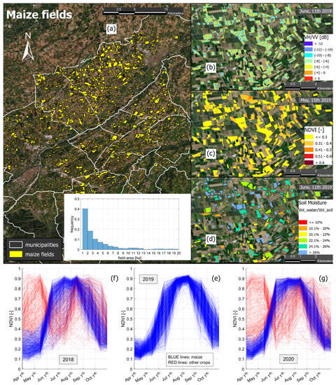 (a) Spatial distribution of maize fields over the studied region and frequency distribution of field areas. (b) Example of VH/VV 10 × 10 m data over the maize fields. (c) Example of NDVI 10 m × 10 m data over the maize fields. (d) Example of soil moisture 10 m × 10 m data over the maize fields. (e) NDVI series for 1154 fields classified as “maize” in 2019. Comparison with NDVI from same fields in 2018 (f) and 2020 (g).