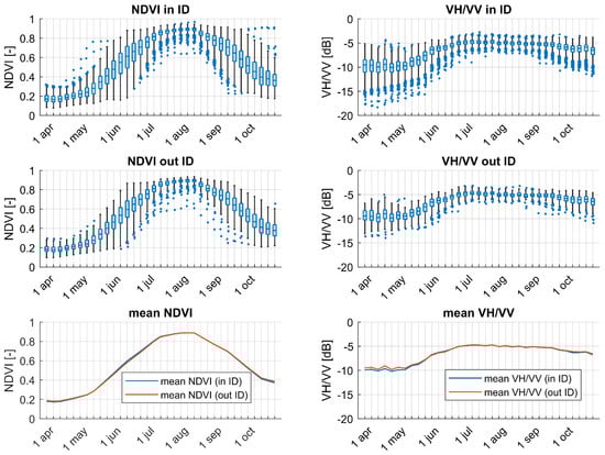 Time series of NDVI values (interpolation of 15-days revisit time) and VH/VV backscattering signal (6-days revised time). Each boxplot represents the distribution of values of NDVI and VH/VV from all the maize fields. The horizontal blue lines in the boxplots represent the 25%, 50%, and 75% quantiles, respectively (from the ground up). The black lines above and under each boxplot include the values within 95% and 5% quantiles, respectively. The blue dots represent the outlier values. In the two lowest subplots the mean daily values of the series are reported.