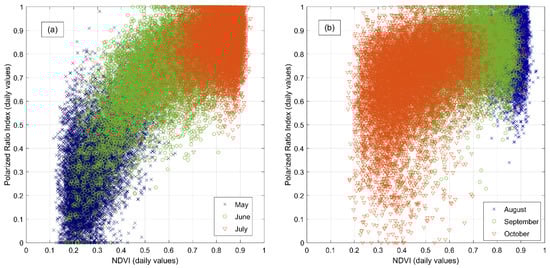 Comparison of daily NDVI and daily Polarized Ratio Index (IPR) over maize fields, for different growing stages. (a): May–June–July period; (b): August–September–October period. Each point represents the comparison between daily NDVI and IPR for a specific field. During the middle and final phases, plants have reached the maximum stage of development (NDVI variability is very low and mainly due to plant health status) and the crop response in terms of NDVI is due to the change of plant color and to the final harvesting.