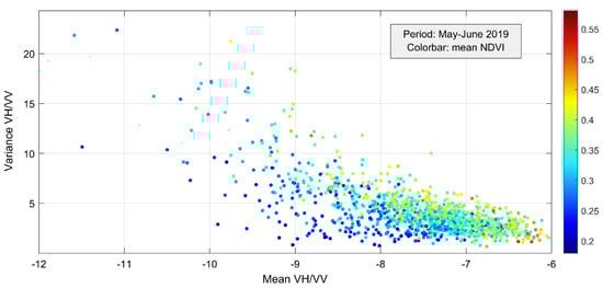 In order to identify the periods in which maize starts to grow, the SAR data were analyzed for the period from May to June. The mean and variance of VH/VV over time in each field are shown in Figure 5: each point in the scatterplot represents the VH/VV statistics from May to June, colored according to the mean NDVI calculated for the same period.