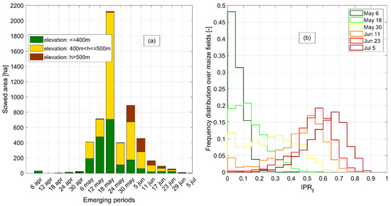 (a) Temporal distribution of emergence periods (i.e., the periods when the plants emerge through the soil). The 6–days revised time refers to the availability of radar data that were used for the analysis. For each day, the hectares where the plants have come out from the ground have been cumulated according to the class of elevation (meters above the sea level). (b) Temporal variation of the frequency distribution. After the end of June, no more fields show values < 0.1, showing that the maize has passed the emergence phase.