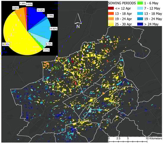 Spatial distribution of sowing dates at 10 m × 10 m resolution. The sowing periods are grouped by 6-days classes. The spatial variability confirms the SAR analysis of emergence periods: for lower elevations, maize is sowed earlier on average.