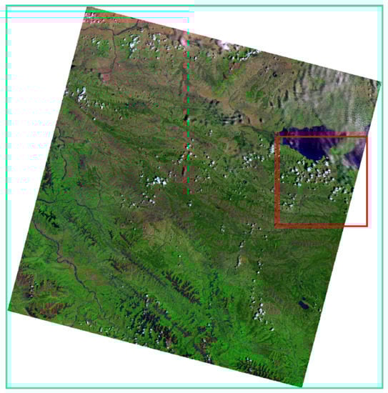 A representative Landsat-8 image with cloud cover after initial data preprocessing (17 July 2018, Path 135, Row 36 (WRS-2), Headwater of Huang River. Note that there are thin and scattered clouds in the red box).