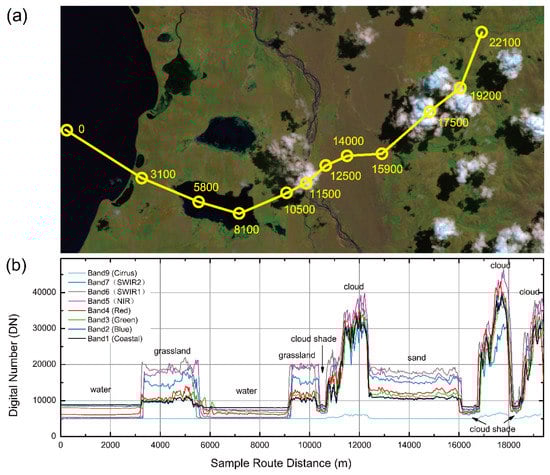 (a) Bands 7, 5, and 3 pseudocolor synthetic images and spectral sampling routes; (b) Digital number (DN) along with sampling route.