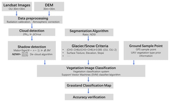 Currently, the most popular algorithms for remotely sensing vegetation classification are multispectral remote sensing compositions, which capture the characteristics of land cover and acquire the classification results more easily compared with radar images and hyperspectral images. In addition, they are low in cost, have high time efficiency, and are suitable for multi-objective and multi-demand-driven vegetation classifications [,,,]. Although multispectral remote sensing images always have a broad field of view and cover a large land surface area, their temporal resolution is coarse [,]. Frequent cloudy weather will severely limit the production of high-quality remote sensing images by optical sensors, especially in the Sanjiangyuan region of the Qinghai–Tibetan Plateau [,]. As these regions have high elevation and alpine, rainy climates, most of the remote sensing images are more or less affected by clouds and snow, which seriously affect the identification and classification algorithms of subsequent images [,,]. In addition, these regions have high elevations and are commonly frigid during the year. Accordingly, the vegetation growing season is extremely short. Cloud-free and snow-free remote sensing images are relatively scarce in the growing season []. Snow coverage and glaciers are the other crucial influencing factors for vegetation classification accompanied by frequent clouds in these regions [,]. How to effectively remove the influence of cloud and snow on images is particularly critical in image processing and application. Therefore, minimizing or removing the influence of cloud and snow is the basis for the accurate interpretation of remote sensing images and is a meaningful way to make remote sensing data reasonable and effective [,,].