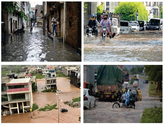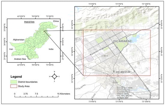 The research area is located between the longitudes of 72°58′ and 73°11′E and the latitudes of 33°35′ and 33°44′N (Figure 1 and Figure 2). The twin cities located at the northern edge of the Potwar Plateau are overlain by Main Boundary Thrust (MBT), creating multiple faults, namely Murree Thrust, Jhelum Fault, and Rawat Fault [49]. The geography of the Rawalpindi-Islamabad region includes mountains and plains that rise over 1175 m [41]. The area is climatically described as a semi-arid to subtropical continental zone with substantial seasonal variations, with temperatures ranging from 0 to 48 °C [50]. In Rawalpindi, the average annual rainfall is 1000 mm (39.3 in), and Islamabad’s average annual rainfall is 1012 mm (39.8 in) [50].