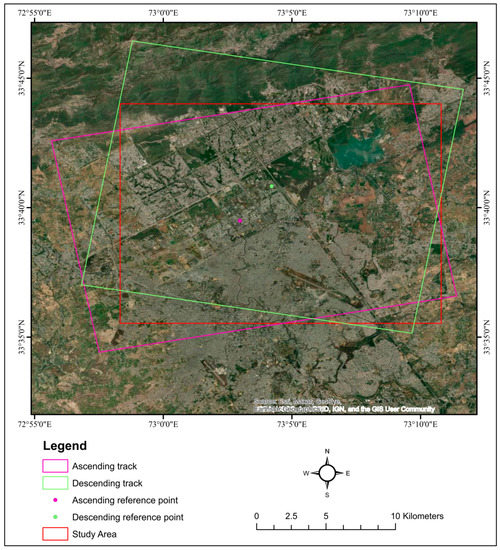 To estimate land subsidence with the help of PS-InSAR technique, we examined Sentinel-1 (C-band) SAR images from Alaska Satellite Facility (ASF) along both descending and ascending orbit paths. PS-InSAR [55] needs at least 20 Synthetic Aperture Radar images [56] to achieve the C-band data analysis. PS-InSAR measures land subsidence over a month or year, considering environmental effects, signal noise, and topographic factors. Furthermore, this sensor is capable of various acquisition modes, such as wave, interferometric wide, extra-wide swath, and strip map. In total, 76 images from the ascending path (7 January 2019–25 June 2021) and 73 images from the descending path (8 January 2019–21 May 2021) were used for this analysis. The properties of Sentinel-1 (descending and ascending) datasets and the parameters employed in this investigation are detailed in Table 1.