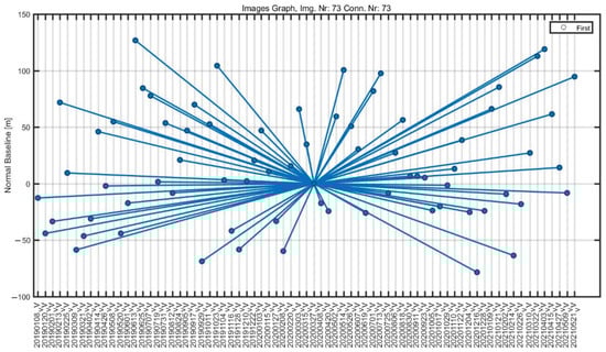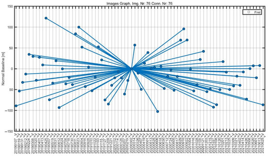 Importing a Single Look Complex dataset with precise paths is one of the computation phases in data research. For this investigation, the images used had the same rotations with ascending and descending orbits. Nevertheless, both ascending and descending images cannot be evaluated together. Thereafter, the polarization was calculated via orbit data, and slave and master images were taken. Initially, extracting the study area’s master images was necessary before moving on to slave images that covered an area similar to the master images. In these conditions, a star graph was plotted between the slave and master images for both orbital directions (descending and ascending) (Figure 5 and Figure 6). During the co-registration step, a specific area was analyzed and co-registered [34].