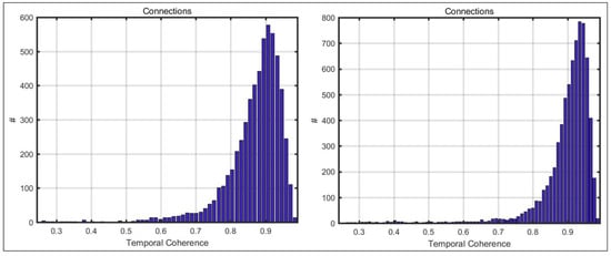 The graphs between the connections and temporal coherence for descending track on the right and ascending track data on the left side.