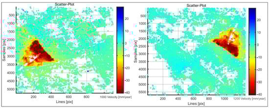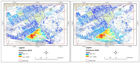 The finalized subsidence map was obtained from 2019 and 2020 to investigate subsidence in the study area yearly to evaluate the subsidence rate of different PS sites over the research time interval (Figure 10). As illustrated in Figure 10, a huge fluctuation was found in the subsidence values from 2019 to 2020; the subsidence value in 2019 ranged from −69.33 to 77.1 mm/yr, while the subsidence value in 2020 ranged from −98.56 to 36.7 mm/yr.