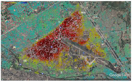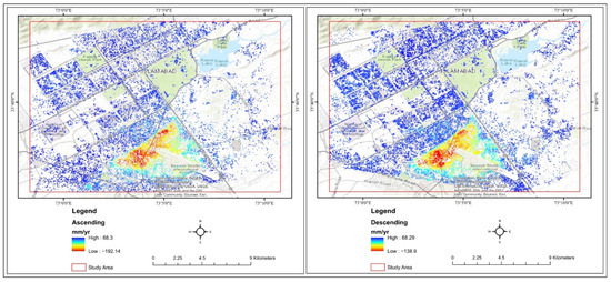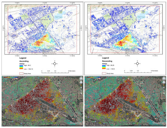 The subsidence map obtained from both descending (path 107) and ascending (path 173) pathways indicated a substantial number of persistent scatterer sites in the analyzed area over the analysis period (Figure 9). The rectangular part of ascending and descending scatter plots is positioned on google earth in the investigated area. Figure 8 demonstrates dense cloud spots in the research area; the results in both the ascending and descending directions reveal that most places are steady (marked in blue), predominantly uplands or mountains. While the primary population places along the main route are displayed in red, there is a severe subsidence zone. The color ramp indicates the movement and relative stability of the persistent scatterer points (red = severe, light blue = stable, yellow/green = minimal).