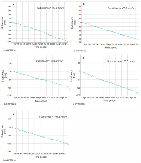 Five PS spots (a, b, c, d, and e) from the subsidence zone were selected from the research area’s ascending and descending findings (Figure 11). In this scenario, the PS points indicate the relative displacement and stability (red = severe, blue = stable, yellow = minimal) compared with the surroundings. Subsidence analyses and these five PS positions are shown in Figure 12.