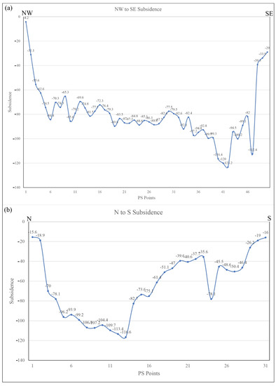The white line in Figure 13 depicts the North-West to South-East subsidence profile. In contrast, Figure 14a depicts the North-West to South-East subsidence profile’s variation graph (x-axis indicates PS points, y-axis indicates subsidence).