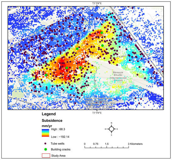 When using PS points to measure movement along the LOS, it was observed that motion in the opposite direction of the sensor was negative, as illustrated in red. Other steady spots inside the investigated area show substantially no movements, as shown in Figure 6. Sites with comparable considerable movement relative to the blue dots are labelled as yellow and orange colors. In the research area, the subsidence was estimated between −25 and −40 mm/yr (Figure 8). The scatter plot data showed severe subsidence in the Rawalpindi area. In contrast, the Islamabad area showed minimal ground movement. One possibility is that Rawalpindi is located on a thicker (softer) alluvium. The other possibility is that it is densely populated with more water extraction and heavy weight of densely constructed buildings.