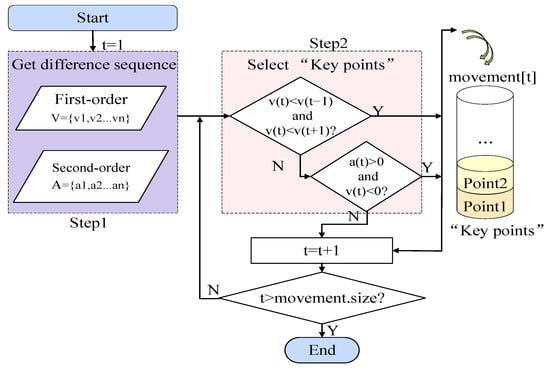 The flow chart of the DDM method of the displacement decomposition is shown in Figure 2. When Vi at time t is both smaller than that at time t − 1 and t + 1, or Vi at time t is less than 0 and the Ai is greater than zero, indicating that time t is the critical point for the step change of landslide displacement. The critical points of these step changes are extracted as the “key” points of the trend displacement component, and the value of all time is completed by the cubic spline interpolation method; then, the trend displacement component with an approximate monotone increasing curve can be obtained. These “key” points show that when the slope’s geological conditions change, it will lead to the step mutation of landslide displacement. The displacement component value of the periodic term is the cumulative landslide displacement value minus the trend term component value. The displacement component value of the periodic term shows reasonable periodicity by eliminating the step mutation caused by the slope’s own geological conditions.