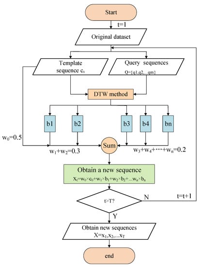 The new sample generation process based on the DTW algorithm is shown in Figure 3. Firstly, a sample is randomly selected from the original data set as the template sequence C. Then, 30 samples were selected as query sequences, and the DTW algorithm was used to screen out 5 query sequences with the highest similarity to template sequences. According to the rules shown in Figure 2, different weights were allocated for samples , and . Finally, a new sample was generated through weighted summation and added to the original data set.