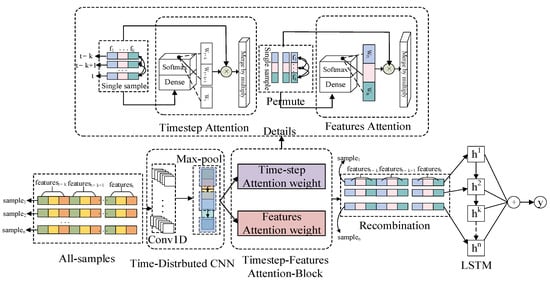In this paper, the timing correlation and environmental characteristic association of the input data are calculated separately. As shown in the network details of the Timestep-Features Attention block in Figure 3, the model assigns an initial weight vector WT () to each sub-sequence based on the time step split firstly, and obtains the correlation between these sub-sequences through training; then transposes the sub-sequence and assigns the initial weight vector WF () to different environmental features in the sequence, different correlations between features are obtained through attention calculation. The above method focuses on the important information from the two dimensions of timing and environmental characteristics, which makes the extraction of effective information more detailed and accurate.
