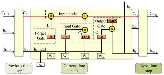 where , , and , respectively represent the values of input gate, forget gate, and output gate of LSTM neural network at time t. represents the input at time t, represents the output of the LSTM network at time t − 1. is the connection weight between the input node and the hidden layer node, represents the connection weight between nodes of the hidden layer and output nodes. , , and are the offset items corresponding to the input gate, forget gate, and output gate, respectively.