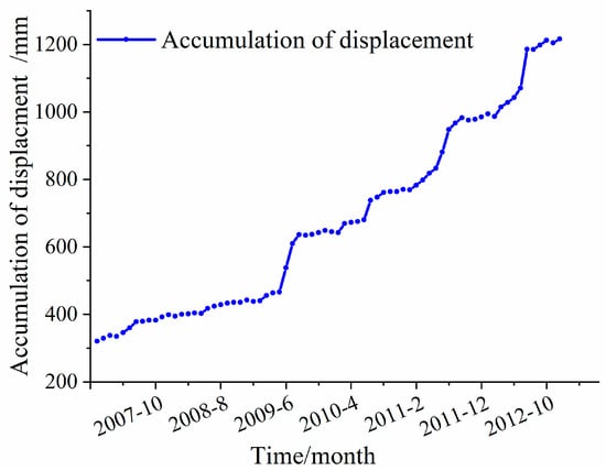 The deformation of geological disasters in the Three Gorges Reservoir area is mainly divided into oscillation, linear, and step types. The step type is the main deformation form of geological disasters with obvious deformation and relatively obvious deformation, which is the key type of geological disaster deformation in the reservoir area that needs to be monitored. As shown in Figure 9, the step type indicates that the cumulative displacement-time curve has an obvious step in a certain period of time, showing the characteristics of step rise. The Baijiaobao landslide and Baishuihe landslide in Zigui County belong to this kind of step landslide, with annual deformation generally ranging from tens of millimeters to hundreds of millimeters, and in the state of deformation or obvious deformation, or even greater or unstable failure damage [].