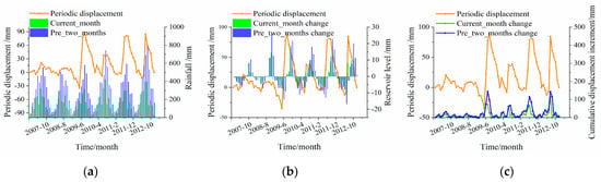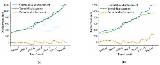 The periodic component displacement can be obtained by removing the trend component displacement from the cumulative landslide displacement. The calculation equation of periodic component displacement component is shown in Formula (20).