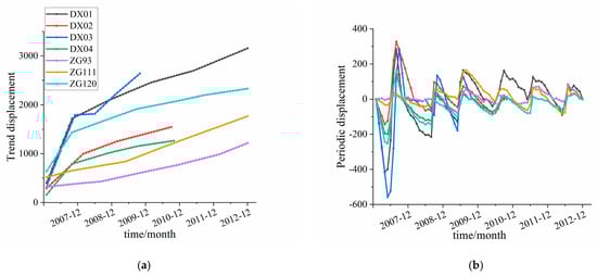 - According to the Difference Decomposition Method (DDM), the cumulative landslide displacement is decomposed into trend displacement and periodic displacement components.