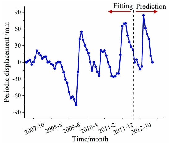 where represents the cumulative landslide displacement and represents the trend displacement component. The periodic displacement component of the ZG110 monitoring station obtained by the DDM is shown in Figure 17. It can be seen that the obtained periodic displacement component has relatively stable periodic characteristics. In this paper, the periodic displacement data from January 2007 to December 2011 are used as training data, and the data from January 2012 to December 2012 are used as testing data for comparative analysis.