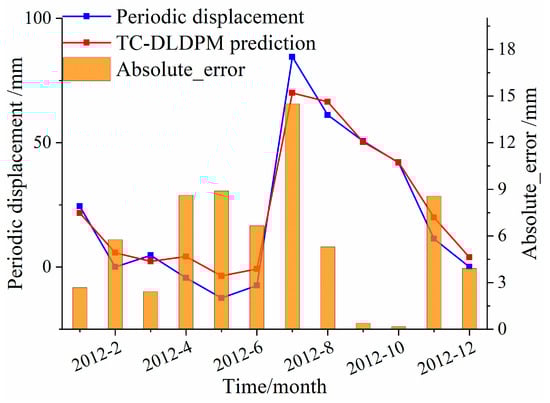 The displacement prediction result of the period term of the ZG110 test set and its absolute error are shown in Figure 18. (1) From January to March 2012, the absolute errors of the predicted displacement component of the periodic term are relatively small, and the predicted results are highly consistent with the real displacement values. Among them, the prediction error of February is relatively large, which is 5.76 mm. (2) From March to May, the displacement of the periodic term showed a slow downward trend, and the displacement error gradually increased. It rose from 2.30 mm in March to 8.89 mm in May. (3) In the landslide disaster-prone period from May to July, the reservoir’s water level decreases to 146.90 m, and the landslide displacement of the periodic term rises in Step-type due to the sudden increase in the monthly rainfall and accumulated rainfall. The minimum error occurred in June, and the error value was 6.67 mm. The maximum error occurred in July, and the error value was 14.50 mm. It shows that the prediction model still has a strong prediction ability when the external influence factors change rapidly, and the comprehensive prediction effect is ideal. (4) From August to December, the reservoir’s water level rose to 174.13 m, the rainfall gradually decreased, and the displacement value of the period term steadily decreased. During this period, the prediction error of the model is tiny, very close to the actual value, the maximum error is 8.56 mm, and the minimum error is 0.16 mm. During the entire test period, the mean absolute error (MAE) and correlation coefficient of the prediction model are 5.66 mm and 0.95, respectively, indicating that the dataset with data expansion and enhancement not only greatly expands the sample size but also has higher stability, which can enable the prediction model to be fully trained during the training process, and the overall prediction accuracy has been improved.