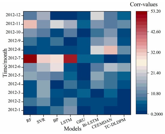 The prediction values of the periodic term displacements of the ZG110 dataset from January 2012 to December 2012 are shown in Table 3 and the monthly absolute error values’ heatmap of the test data set is shown in Figure 19. It can be seen in Figure 19 that the experimental results of shallow learning network RF, SVR, and BP networks for periodic displacement prediction are not ideal, especially when the environmental factors like rainfall (June, July, August) change violently, the prediction error is relatively large; the prediction error of LSTM and GRU networks is smaller than that of shallow neural networks, but the model does not better fit the periodic displacement evolution trend when the environmental factors change greatly; the combined deep learning models Bi-LSTM and CEEMDAN which are specifically targeted for the “Step-type” landslide prediction can fit the evolution of periodic displacement well and have a better prediction. However, the TC-DLDPM proposed in this paper can perform more detailed and accurate training based on pre-training, so the prediction result error is smaller and the coherence coefficient (R2) of the model is greater.