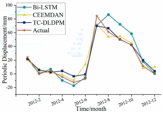 By comparing the simple deep learning model Bi-LSTM and the combined deep learning model CEEMDAN which have better prediction precision than the TC-DLDPM model proposed in this paper on the ZG110 testing set, the prediction fitting results can be seen in Figure 20. Among the three prediction methods, the fitting result of Bi-LSTM is the worst. Combined with the error analysis in Table 3, the MAE error of the Bi-LSTM is 8.49 mm; the prediction results fit well with the real data from January to June 2012, but from July to October, when the rainfall and reservoir water level change greatly, the prediction error effect is very poor, and the maximum absolute error occurs in August which reaches to 25.18 mm. In addition, there is a lag in the prediction of the fluctuation trend of periodic landslide displacement, which indicates that a single Bi-LSTM model is still greatly influenced by the external environment when predicting the complex nonlinear evolution process of landslide displacement. In addition, because RNN iterates in time order, the error of Bi-LSTM will be superimposed gradually, resulting in a large fitting deviation. While the fitting result of the CEEMDAN combination model is relatively better and the average error of the prediction for the whole year of 2012 is only 6.68 mm, which is better fitted with the real data, and the fluctuation trend of periodic displacement is also well fitted, but similarly, there is still a large error in the rainy season from June to August 2012, the maximum prediction error occurs in June which is 21.32 mm. The TC-DLDPM model proposed in this paper achieves much better results in both the fitting of the fluctuation trend and the prediction of monthly displacement. The overall MAE error is only 5.66 mm, and it has a better prediction effect no matter how the external factors such as rainfall and reservoir water level change. It is because this method has learned the common characteristics of a large number of landslides of the same type in advance and then focuses more on the characteristics of their own time series and environmental factors, so it has better prediction accuracy.