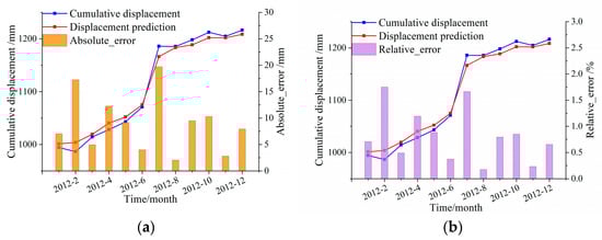 Accuracy comparison results between the predicted value of cumulative displacement and the actual observed value. (a) Absolute error. (b) Relative error.