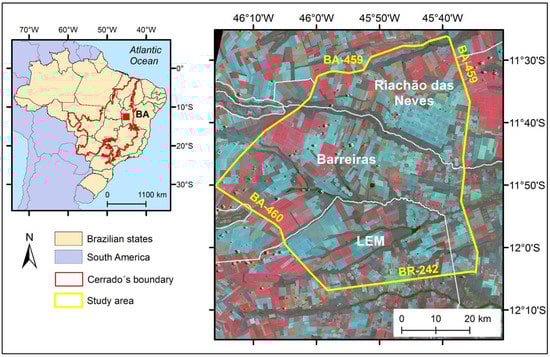 Location of the study area in the Bahia State, Brazil (inset figure), limited by the BR-242, BA-459, and BA-460 highways. The RGB color composite corresponds to the Landsat 9 OLI image (path = 220; row = 68), bands 5, 6, and 4, acquired on 1 March 2022. BA = Bahia State; LEM = municipality of Luís Eduardo Magalhães.