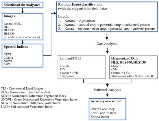 Our study can be characterized as an applied research with a qualitative–quantitative approach, using technical procedures based on a study case, and Figure 2 summarizes the proposed methodology. The Landsat 8 (L8) and the Harmonized Landsat Sentinel-2 (HLS) images acquired during the 2021–2022 crop growing season were classified by the non-parametric Random Forest (RF) classifier using training samples collected during the field campaign conducted in December 2021. The main steps of the proposed method are detailed in the following subsections.