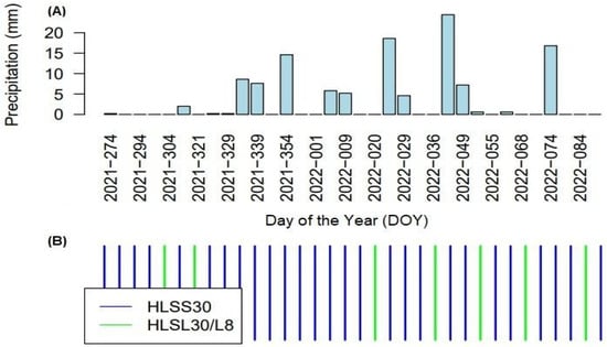 (A) Daily rainfall data measured by the automatic meteorological station located in the municipality of Luís Eduardo Magalhães during the 2021–2022 crop growing season over the study area. (B) Landsat 8 OLI, HLSL30, and HLSS30 images selected during the 2021–2022 crop growing season.